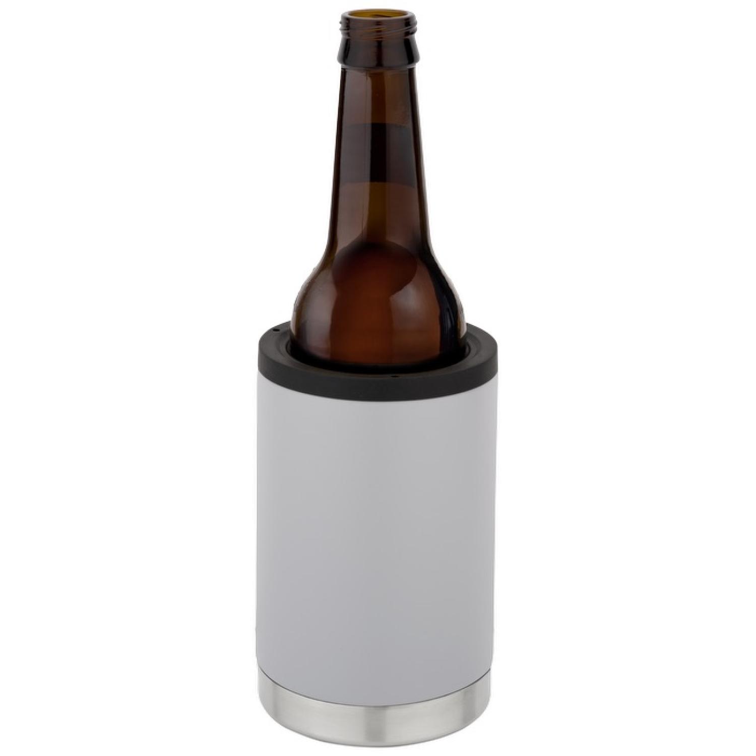 3-in-1 design transitions between poured drink insulated tumbler, 12 oz can cooler, and 12 oz beer bottle cooler Fits in most corporate and personal coffee machines Vacuum-insulation maintains optimal 6X drinking temperatures 18-8 Stainless Steel dual-walled construction Lead-free in all accessible components 1-year limited warranty Features 2 attachments: clear screw-on, sip-through lid and a black can/bottle ring Twist top rubberized ring to hold a standard 12 oz. can or bottle. 3.25″ D x 3.25″ W x 5.125″ H
