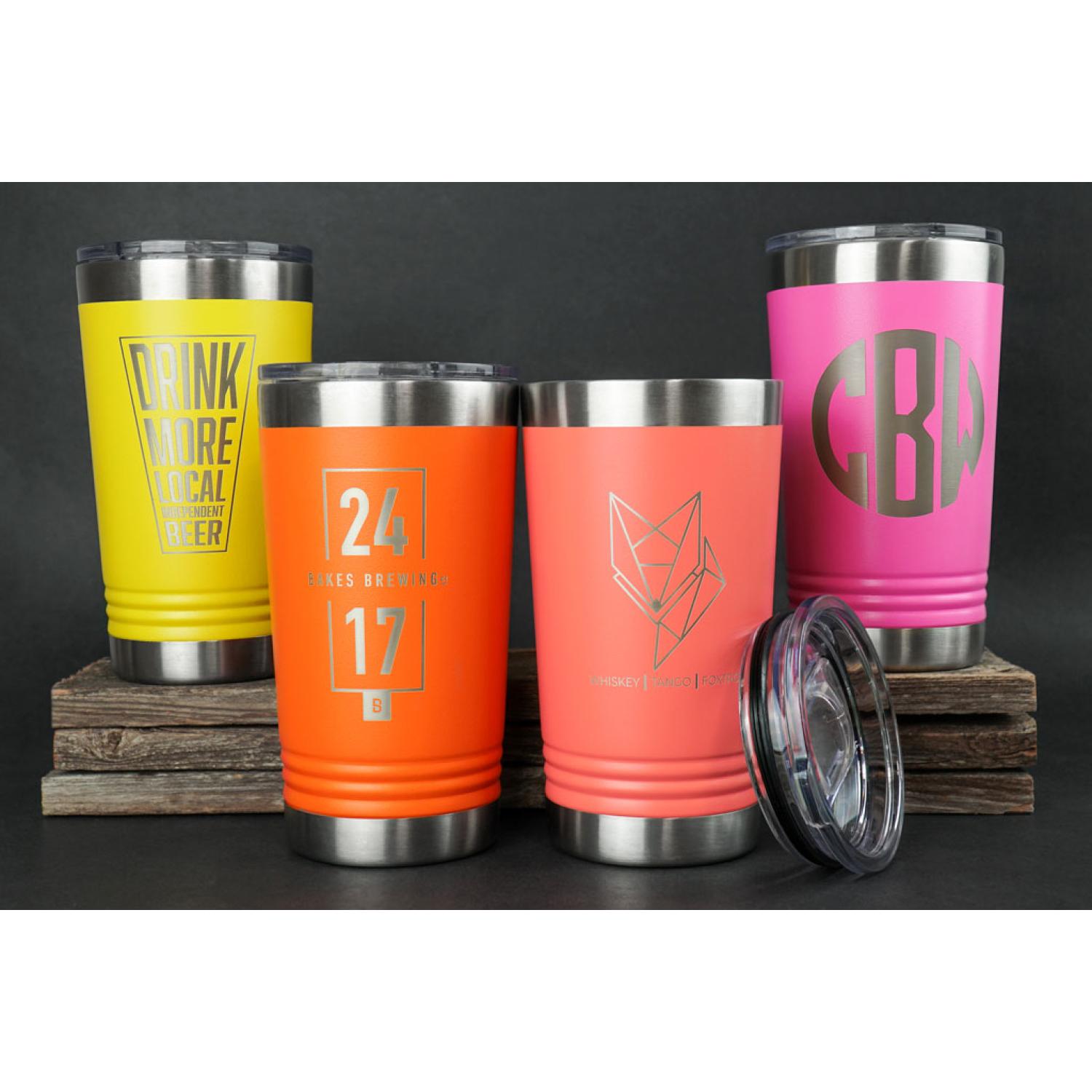 Seamlessly constructed from durable stainless steel, these popular Polar Camel Metal Pint Tumblers come personalized with silver laser etching. Double-wall, vacuum insulated construction holds heat and cold up to 2X better than plastic tumblers! The pint glass is a symbol of relaxation and good times – it’s the link between you and a tasty, cold beverage after a long days work. 3.375″ W x 6″ H