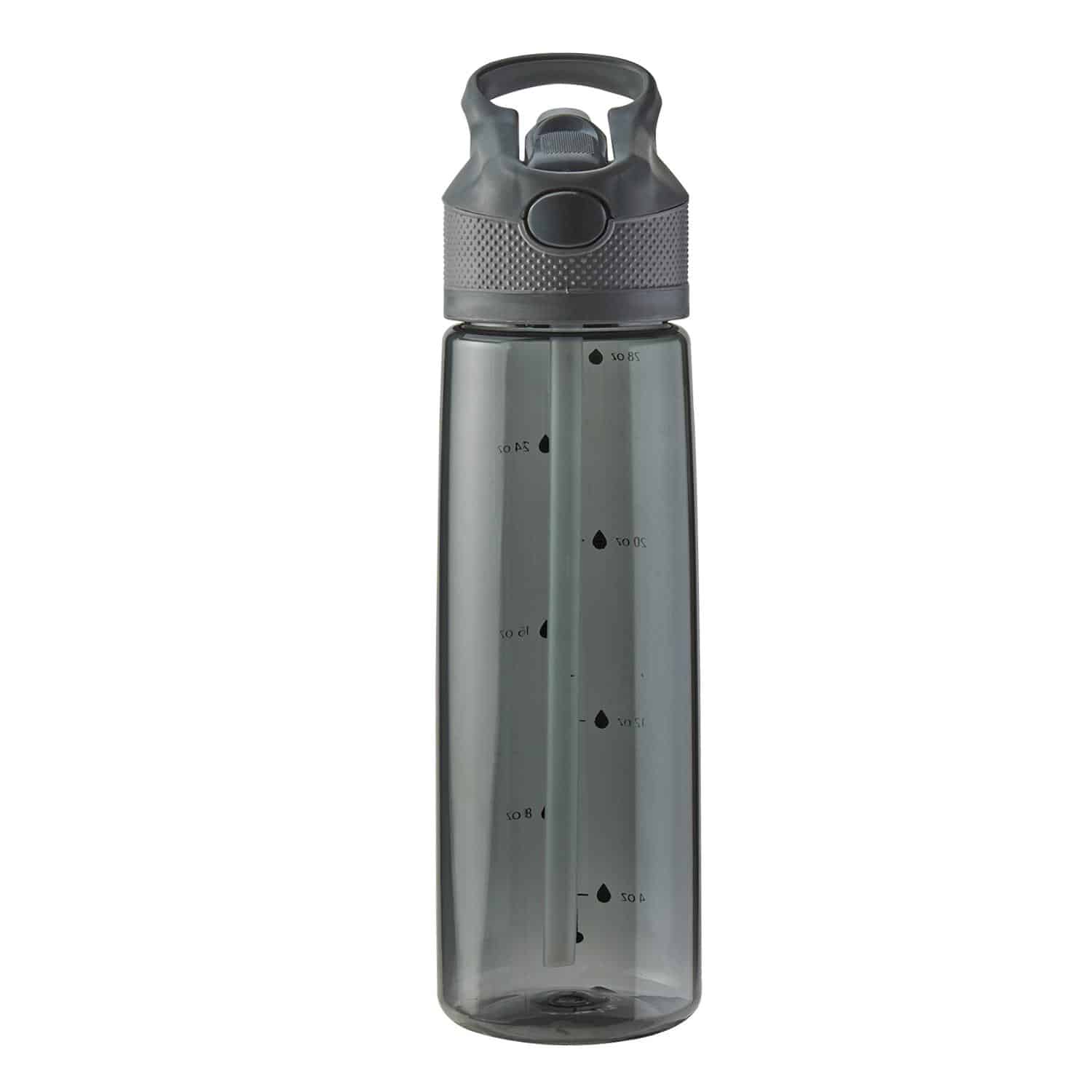 Water bottle features a drinking spout with straw. Auto flip spout flips up with a push of a button. Capacity markings for easy measuring and tracking. Screw on lid is built with a carrying handle and matching textured accent. Fits most vehicle cup holders. Hand wash recommended. 11 1/8″ H x 3 1/4″ D