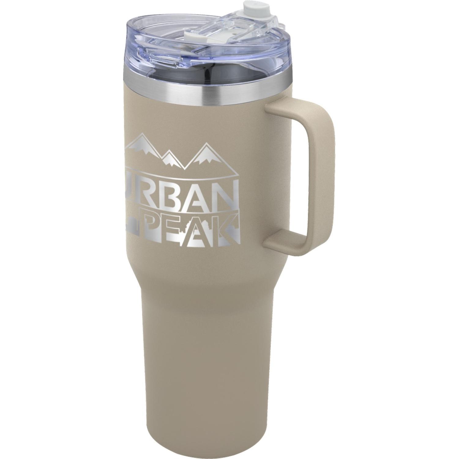 Dual walled Stainless Steel construction Sweat-free design Durable powder-coated finish with a Stainless Steel top rim NOTE: Straws will ship in bulk inside the box, not assembled inside of drinkware Includes one clear Tritan straw Lead-free vacuum seal Features a push-on, AS plastic flip top with Tritan snap locking closure lid and straw hole 1-year limited warranty Sturdy Stainless Steel handle Copper lined, vacuum-insulated liner maintains optimal 12X drinking temperatures. 5.5″ D x 4″ W x 10.875″ H
