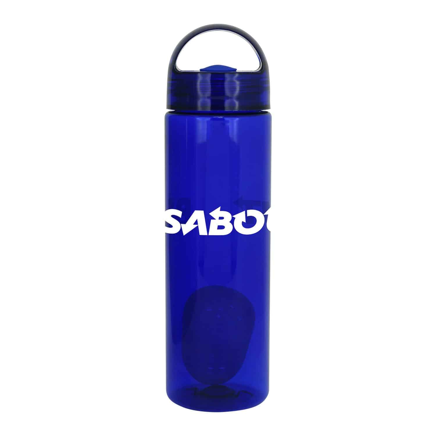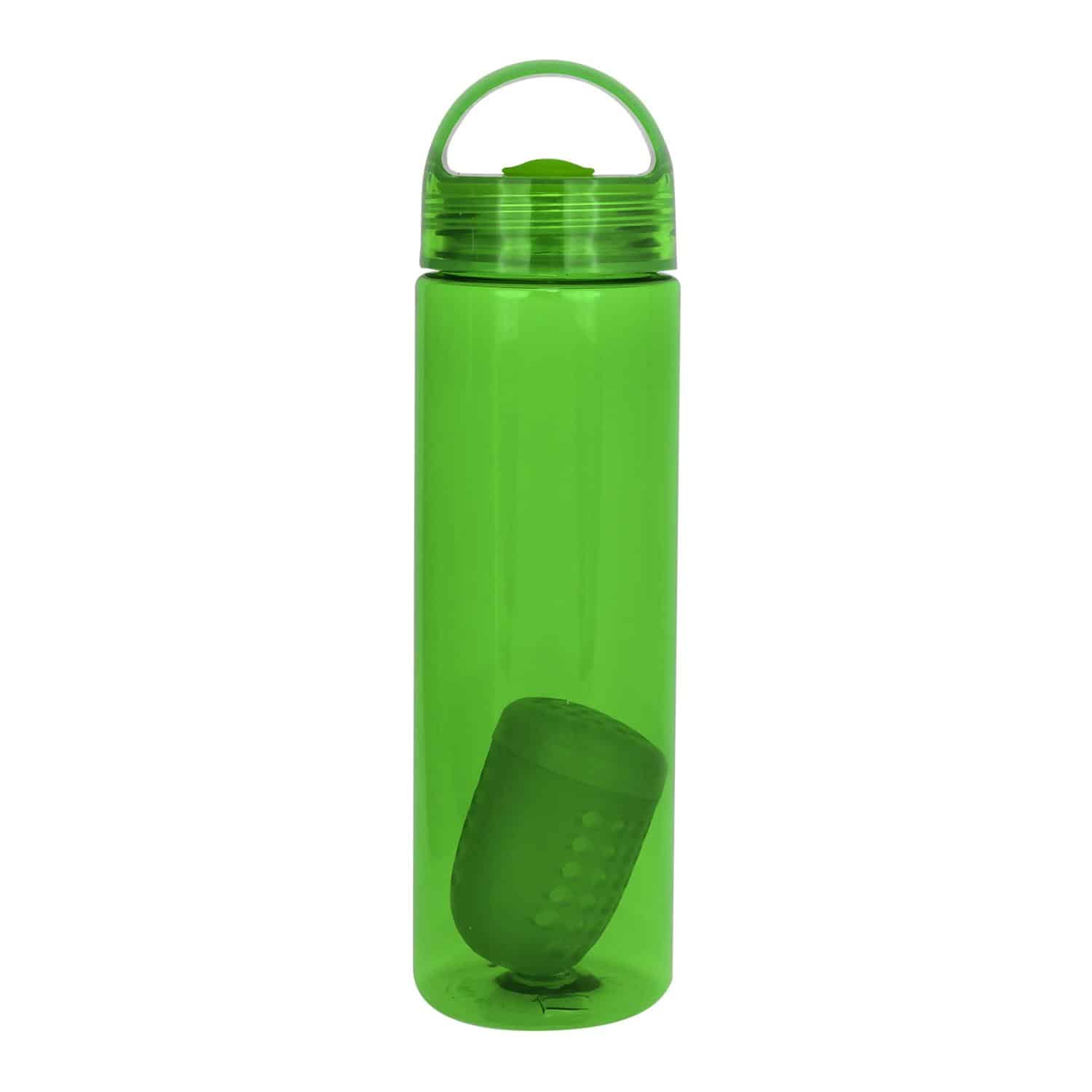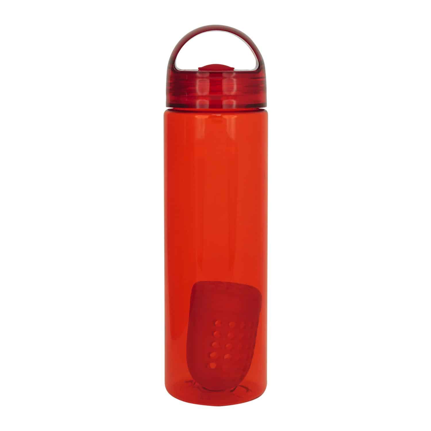 Introducing our stylish and convenient 24 oz. refillable water bottle complete with a floating infuser that adds a burst of flavor to your hydration routine. With a capacity of 20-22 oz. when filled with fruit, this bottle is perfect for adding a refreshing twist to your water. The lid features a silicone gasket and a rounded arch handle for easy carrying. Crafted from BPA-free materials, this bottle is both safe and eco-friendly. Please note, this bottle is not recommended for use in the dishwasher or microwave. Elevate your hydration game with our colorful water bottle today! Complies with Prop 65. 2.75″ D x 10″ H