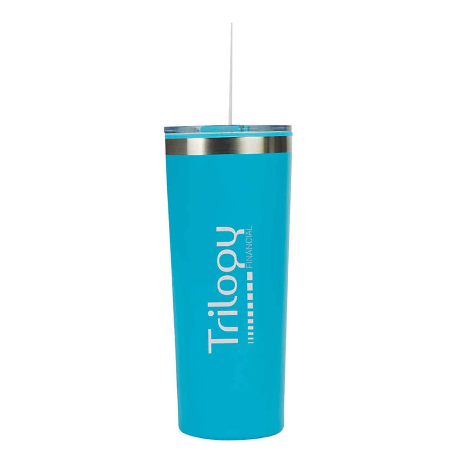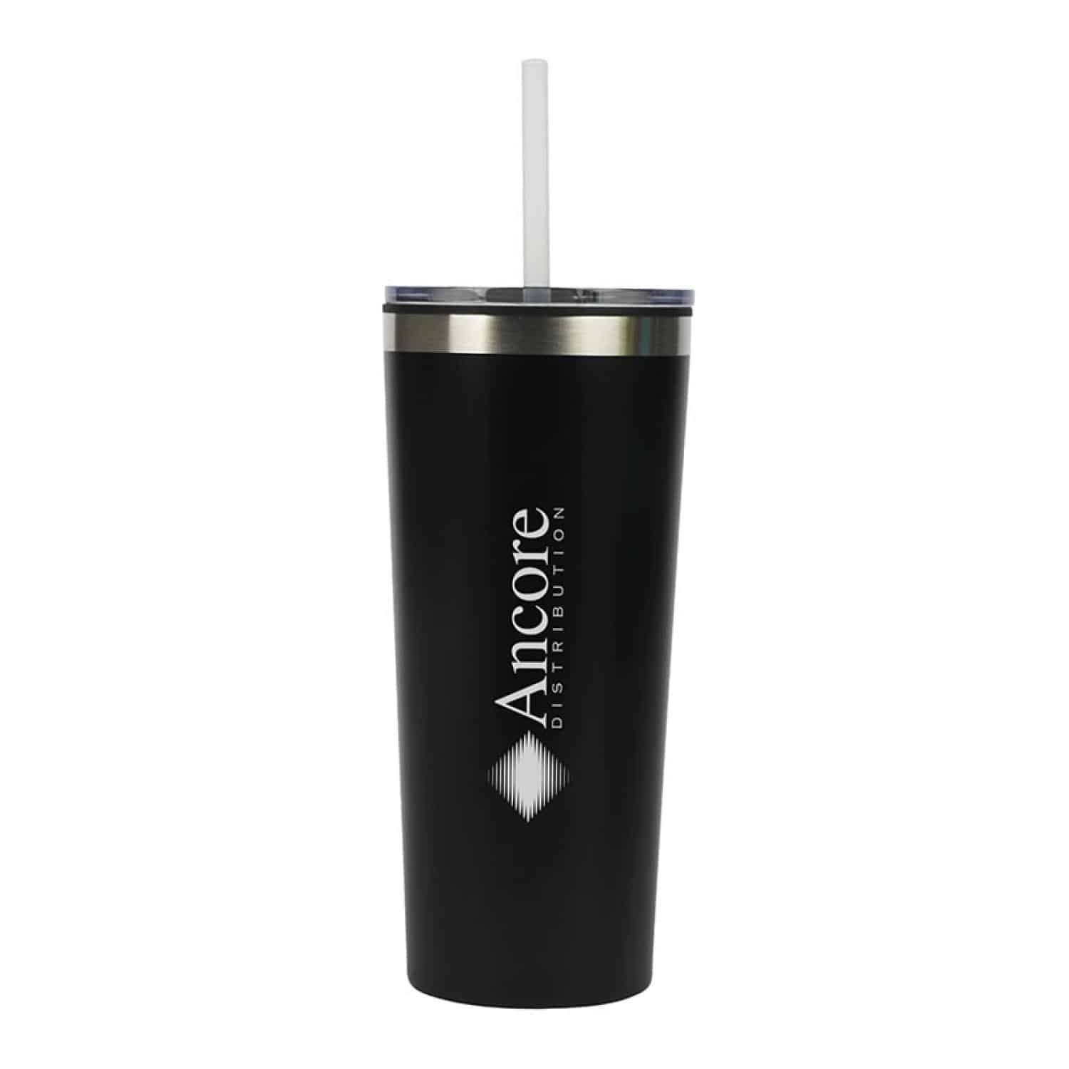 Designed to be lightweight yet durable, the Bremen 24 oz. Tumbler is ideal for everyday use. Its ergonomic shape fits comfortably in your hand and fits most standard car cup holders, making it a perfect companion for your daily commute, office environments, or outdoor adventures. This reusable tumbler features a double wall construction with stainless steel exterior and an eco-friendly 50% recycled polypropylene inner wall. The push-on translucent lid features a spill-resistant slider closure allowing you to confidently take your tumbler on the go and the included drinking straw provides you a hassle-free drinking experience even when you are on the move. FDA compliant and BPA Free. Complies with Prop 65. 3 5/8″ W x 10 1/4″ H x 3 1/2″ D