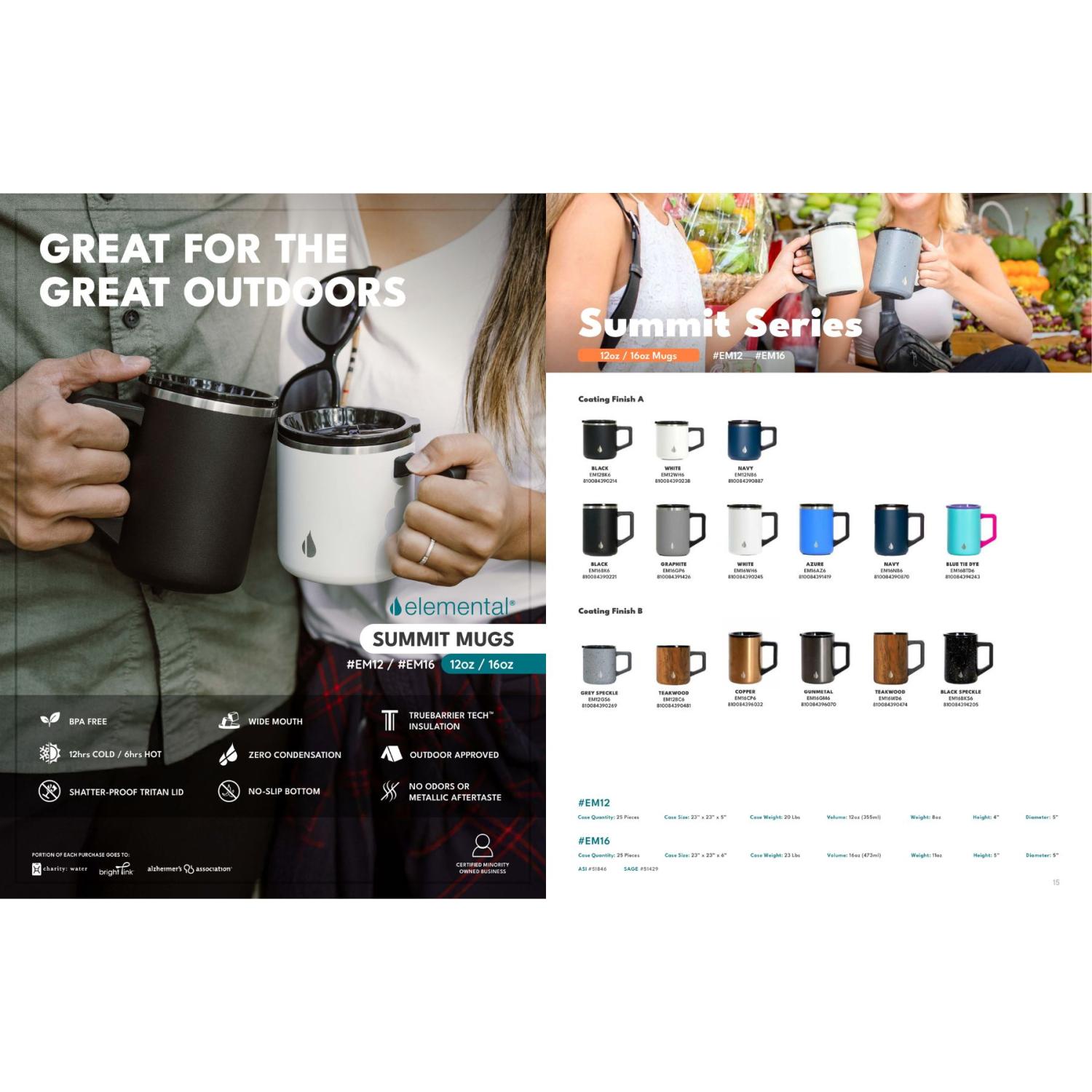Elemental Insulated Summit Mug your rugged companion for outdoor adventures. Crafted with a lightweight design and triple-wall insulation, this mug keeps your drinks hot for up to 6 hours and cold for up to 12 hours, ensuring you stay refreshed throughout your hike or camping trip. With True-Barrier technology, it remains free from condensation, while the shatterproof Tritan lid guarantees durability on the trail. Complete with a comfortable handle for easy carrying, this mug is the perfect choice for trekking through the wilderness or enjoying a scenic picnic. Complies with FDA, Food Grade, Prop 65. 5″ Diameter x 5″ H