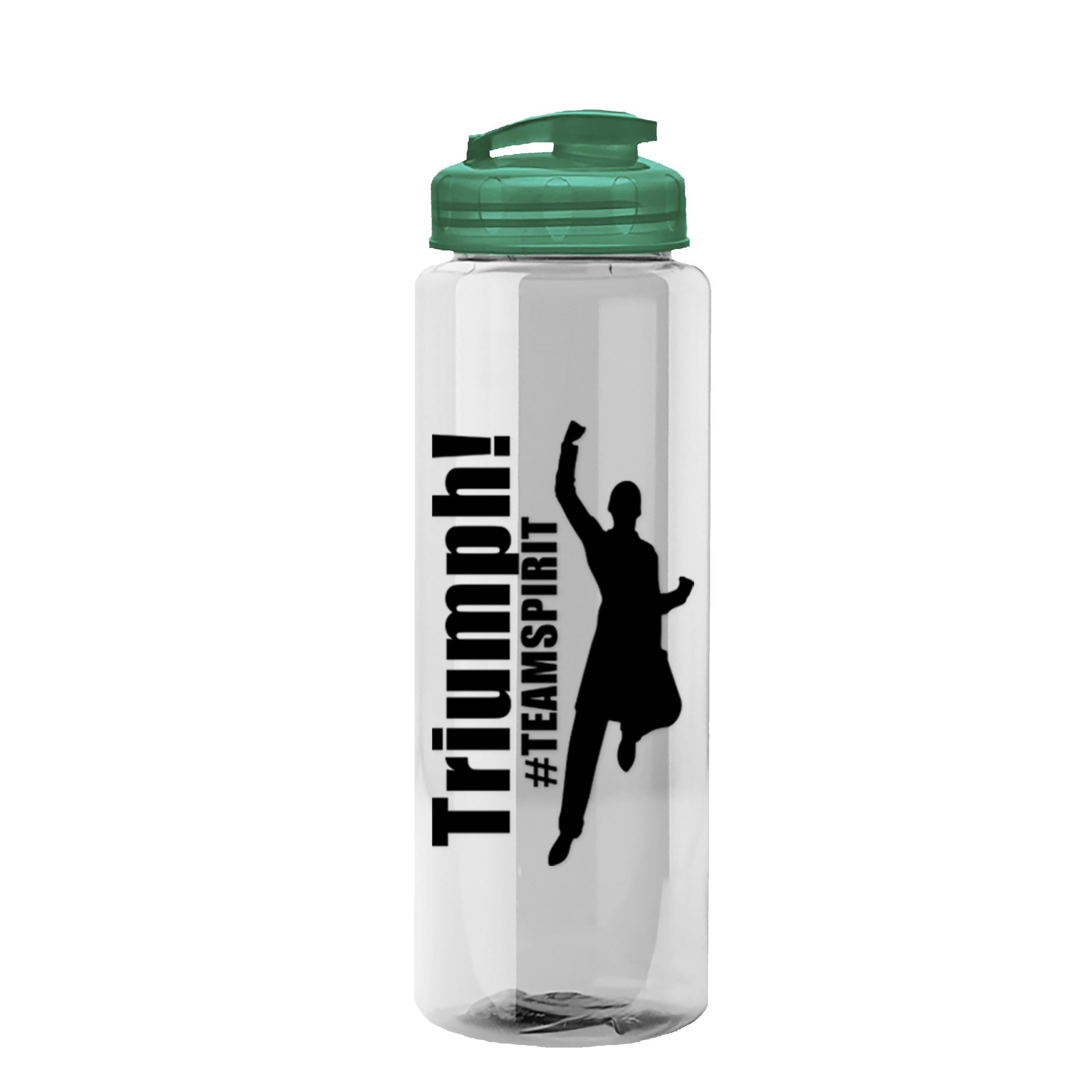 Fuel your day with this 32 oz. transparent straight-wall bottle, designed for outdoor adventures and daily use. The drink-through, flip-top lid offers quick and easy sipping, while the large capacity ensures you stay hydrated wherever you go. Mix and match bottle and lid colors to make it your own, and upgrade with an optional Motivational Measurement imprint on the second side, available at no extra charge when using the same screen print ink color as your side-one imprint. Complies with Prop 65. 3.25″ W x 9.75″ H x 3.25″ D