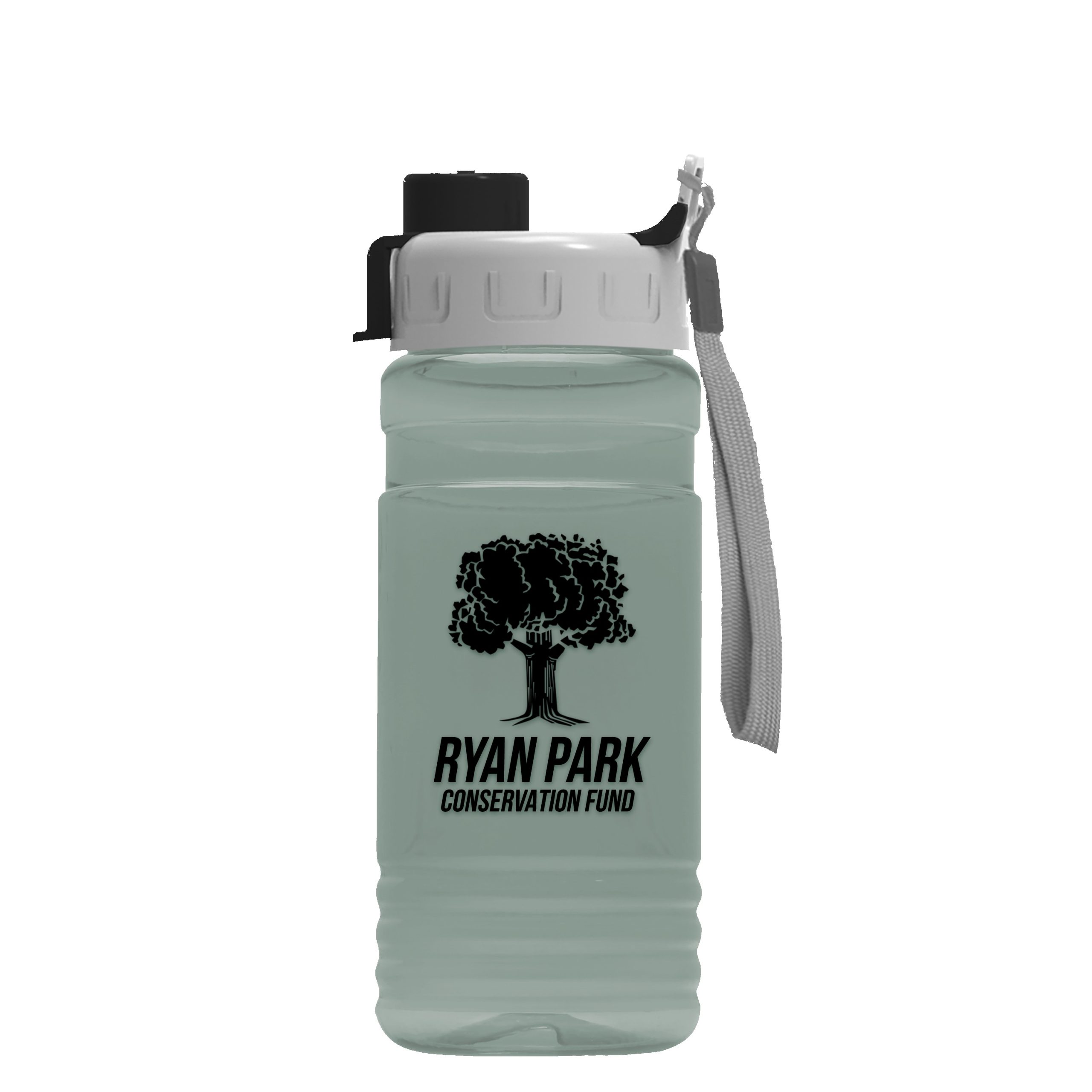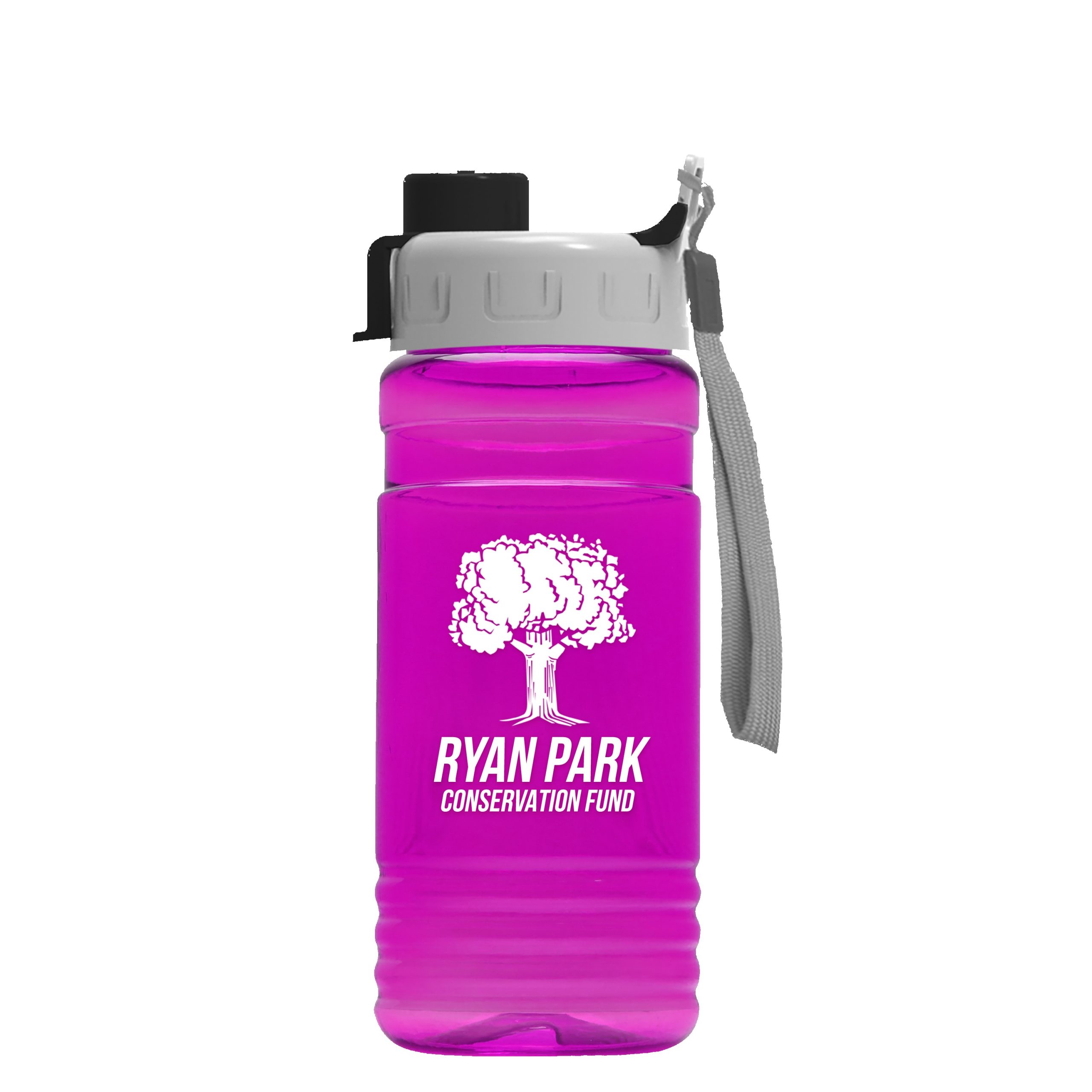 Stand out with this 20 oz. bottle featuring a unique straight-wall cylinder design and compact shape. Molded with 98% post-consumer recycled PET, it?s a reusable, sustainable option for everyday hydration needs. The sip-through spout with quick-snap cover keep spills at bay and an attached wrist strap is perfect for an on-the-go lifestyle. Mix-and-match lid and bottle color options let you create a unique look. Complies with ANSI, CPSIA, FDA, Prop 65. 2.875″ W x 8″ H x 2.875″ D