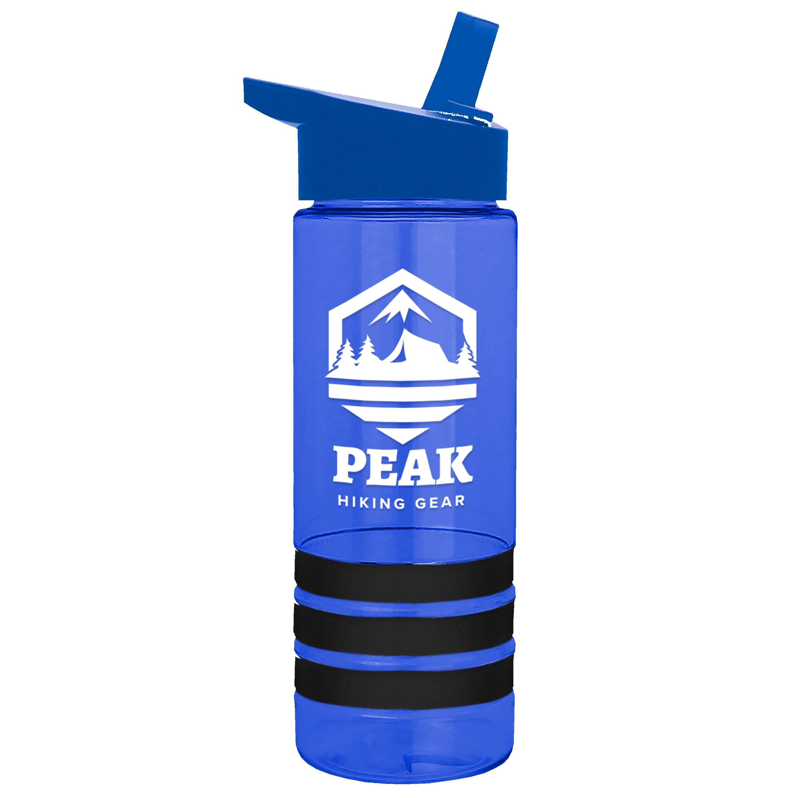 This 24 oz. transparent Tritan® bottle features a textured, grip-enhancing base that?s built for easy handling on any adventure or outing. A flip-straw lid with molded carry loop makes sipping and transport simple, while the wide opening allows for effortless filling and cleaning. Mix and match bottle, lid, and grip band colors to create a unique look that highlights your brand?s personality. Complies with ANSI, CPSIA, FDA, Prop 65. 2.875″ W x 9.25″ H x 2.875″ D
