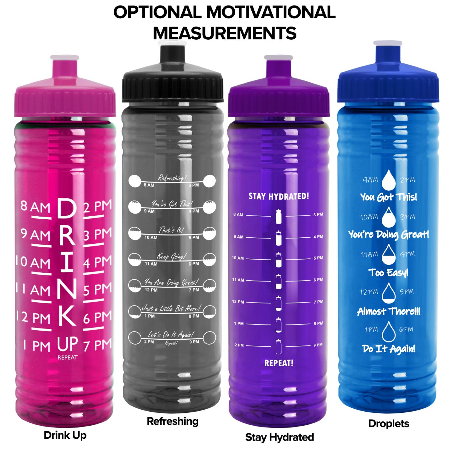 Stay refreshed with this 24 oz. bottle featuring raised ring accents. The push-pull lid makes on-the-go hydration a breeze, and its slim design fits most cup holders. Mix and match bottle and lid colors to create a custom look, and upgrade with an optional Motivational Measurement imprint on the second side to easily track daily water intake. This feature is available at no extra charge when the screen print ink color is the same color as your side-one imprint. 2.75″ Diameter x 9.75″ H