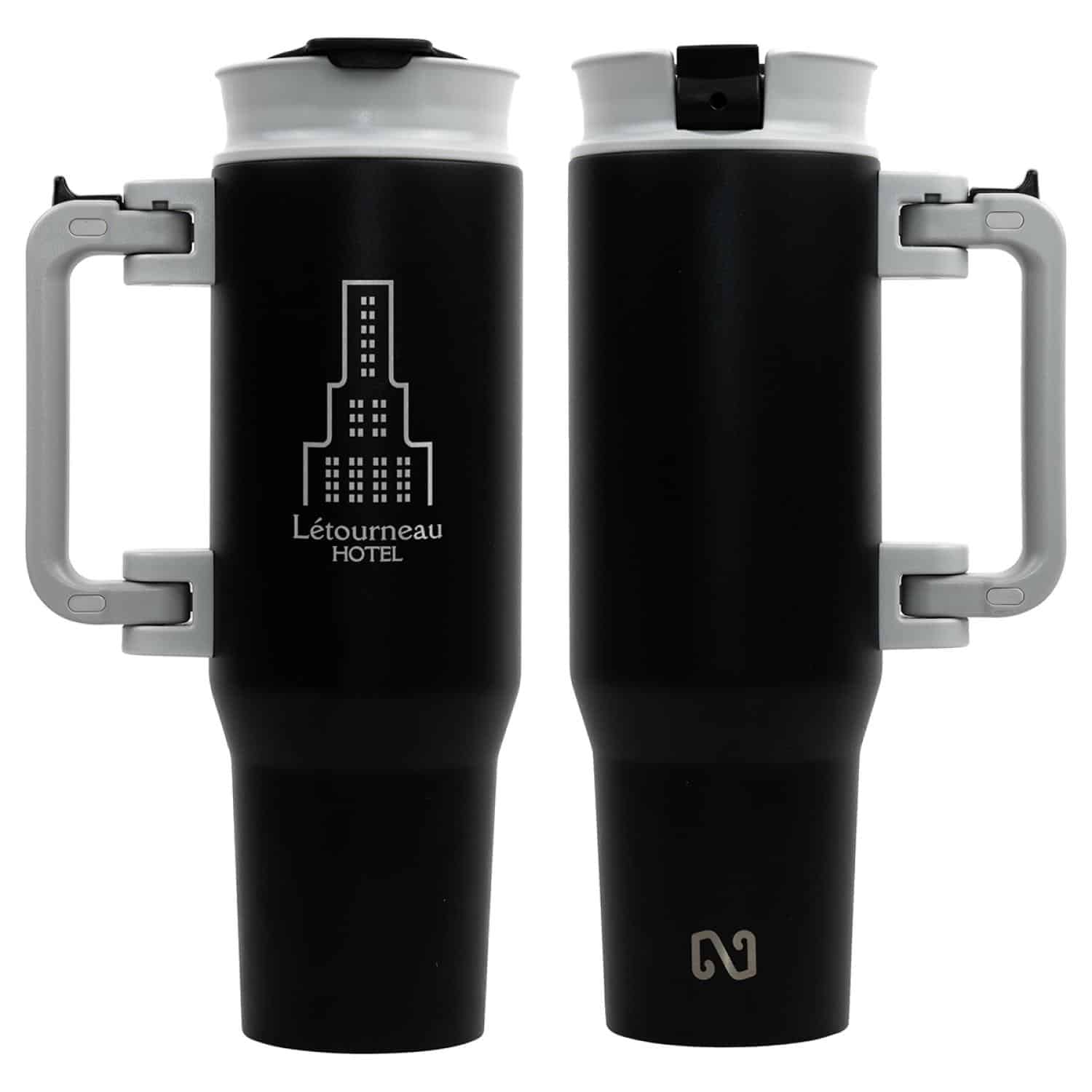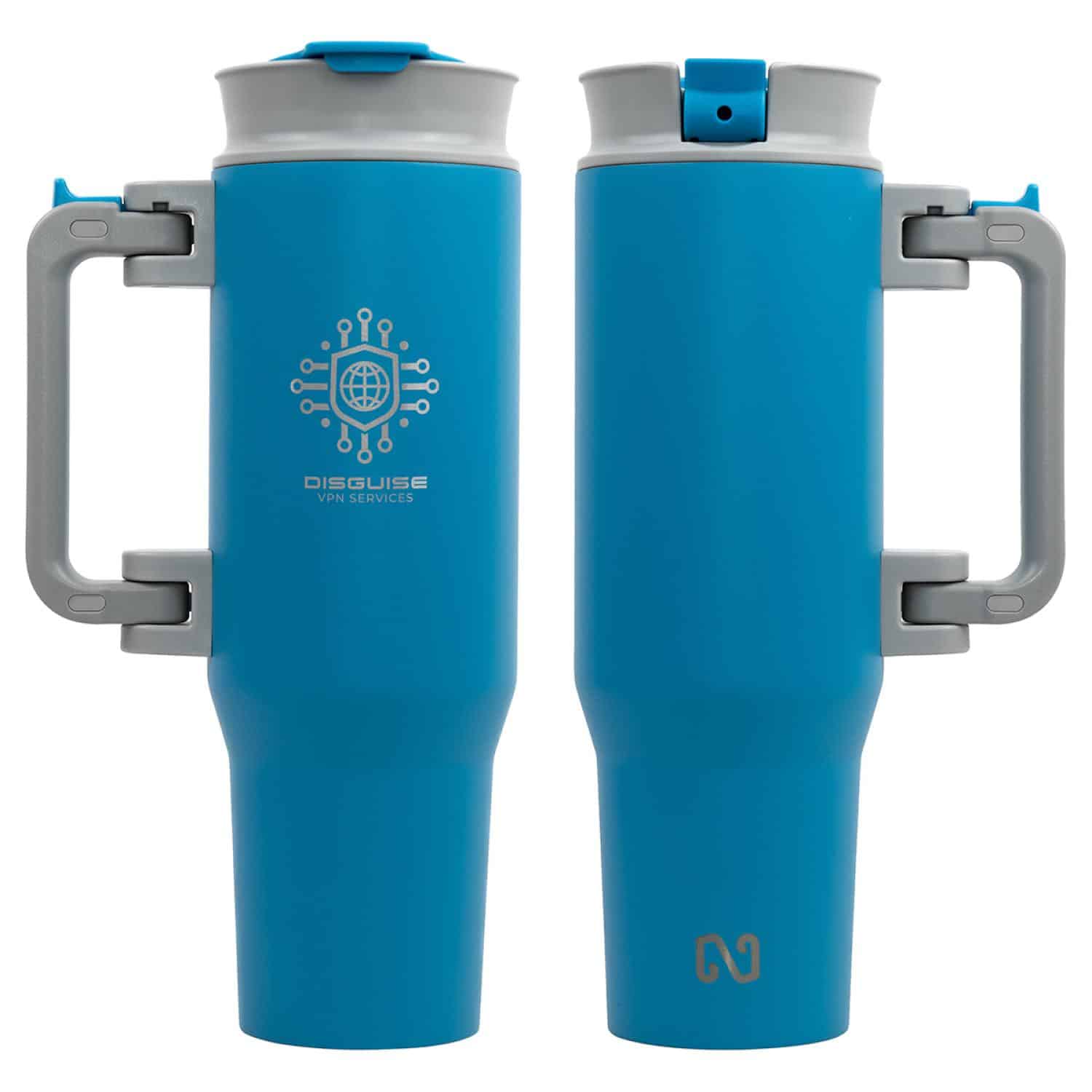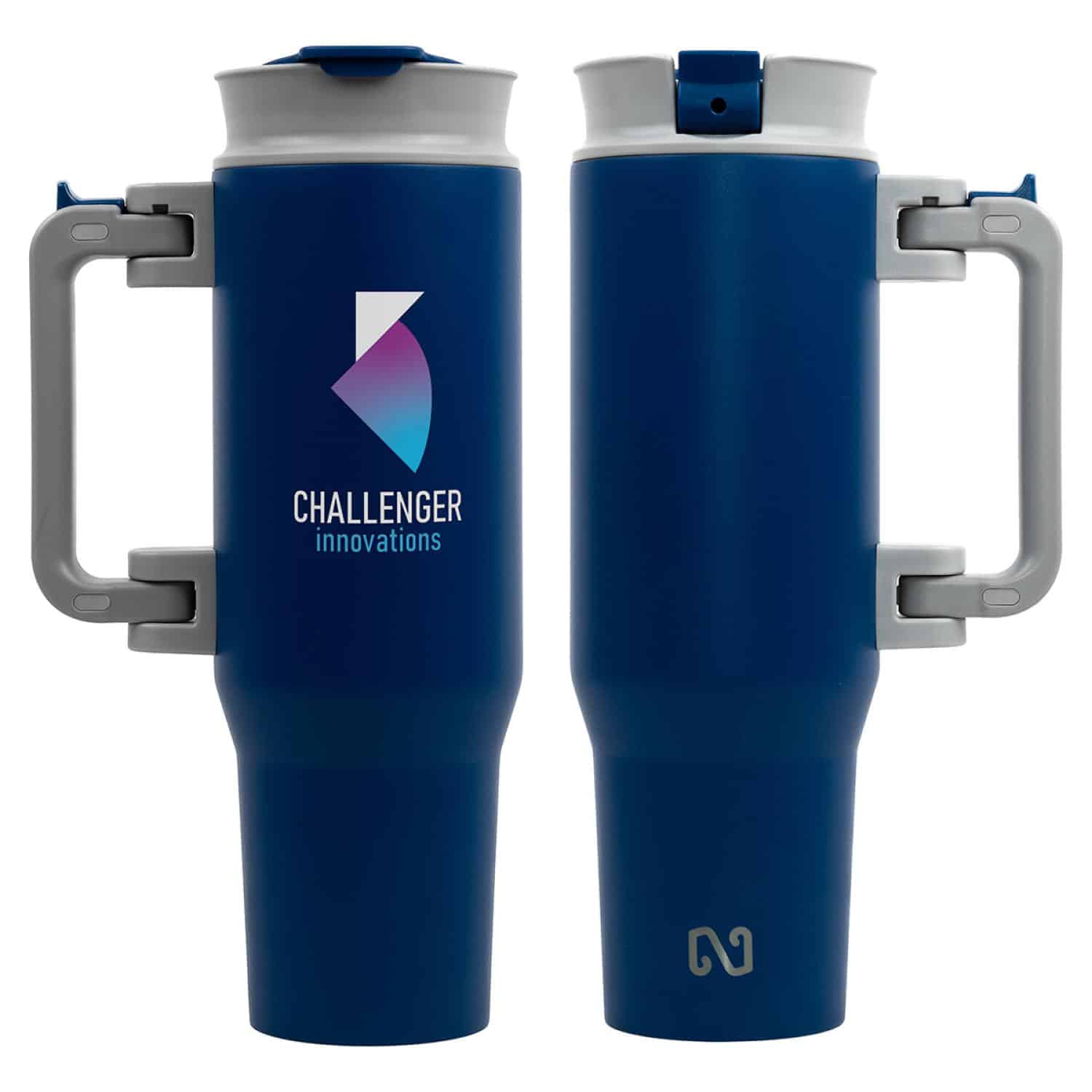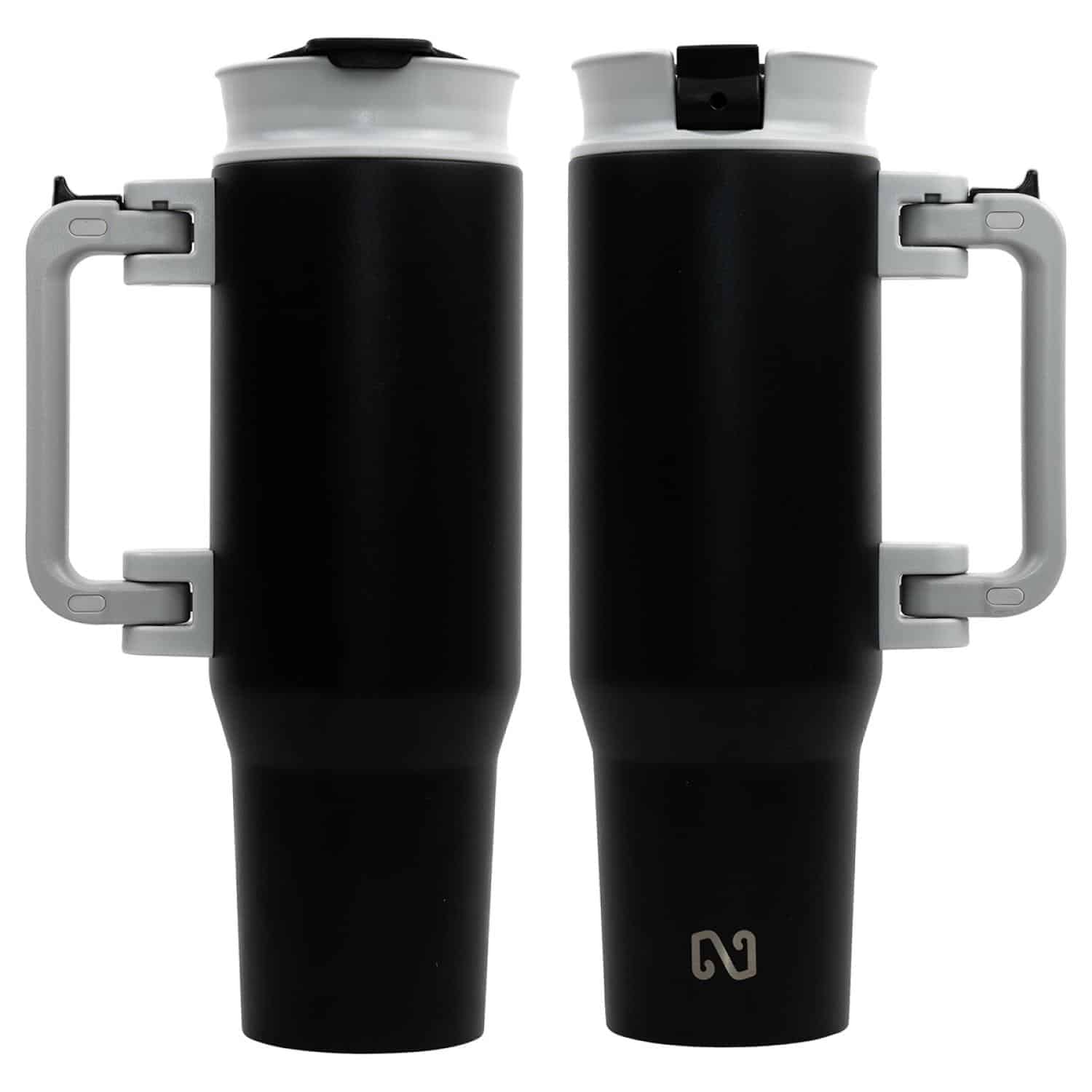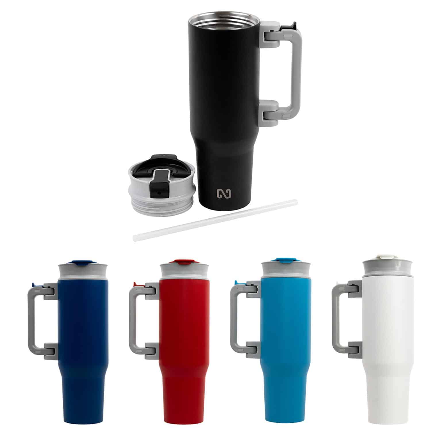 The NAYAD® Genesis 40 oz Stainless Steel Double-Wall Mug features an innovative foldable handle for compact storage and portability. Crafted with rust-free 18/304 stainless steel and a powder-coated matte finish, its heavy-duty 4 mm inner and 5 mm outer walls offer exceptional durability. Double-wall and copper-lined insulation keep beverages cold for 10 hours. Includes spill-proof dual-function and straw lids, and car cup holder compatibility. FDA certified. Complies with FDA, Prop 65. 11.5″ H x 3.75″ Diameter