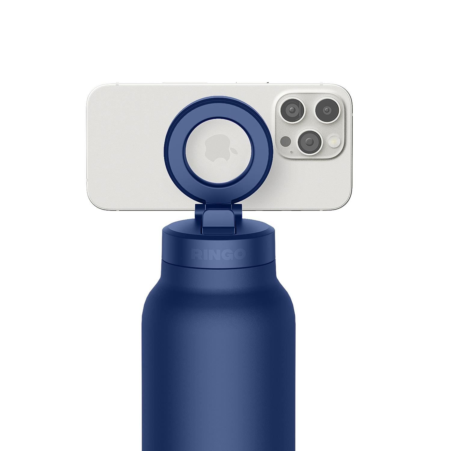 Stay refreshed and hands-free with the RINGO Pro Water Bottle. This 24 oz. bottle keeps drinks ice cold while the MagSafe-compatible magnetic ring securely mounts your phone at any angle. The flip-up straw lid is leakproof and easy to sip from, while the powder-coated finish resists scratches and scuffs. Durable, stable, and travel-ready-RINGO redefines hydration on the move. Complies with CPSIA, Prop 65. 3″ W x 9.5″ H x 3″ L