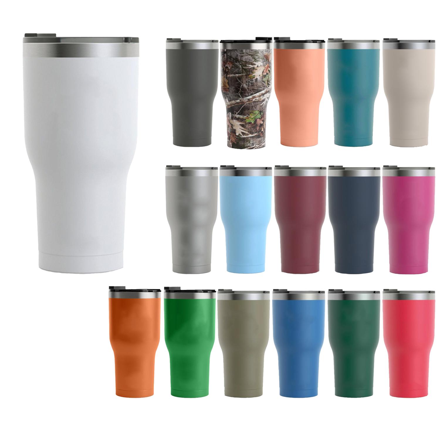 Make the morning work or school commute just a bit more tolerable when you bring along your favorite drink in this colorful tumbler from RTIC. Made of double wall insulated stainless steel, this 30 ounce capacity vessel maintains the temperature or hot or cold drinks for hours — add ice for even longer lasting refreshment. Ringed design. Secure, sip-through lid. Add your school, sports team, organizational or company logo or message through our signature laser engraving method to customize. 3.5″ Diameter x 7″ H