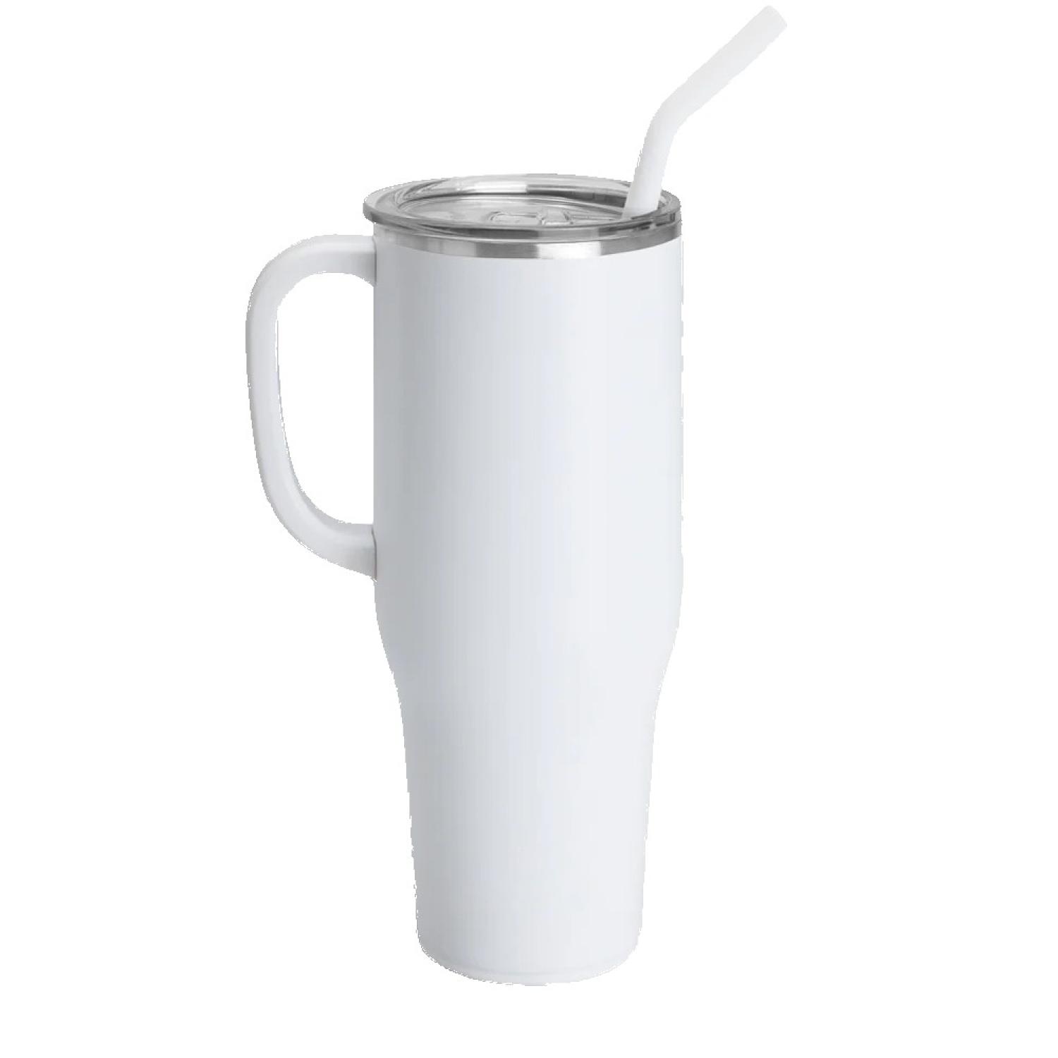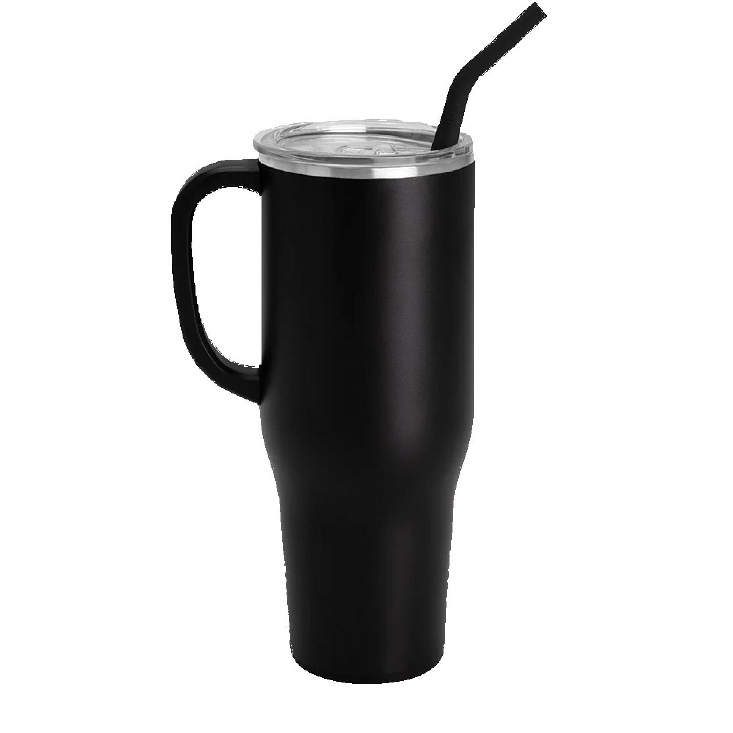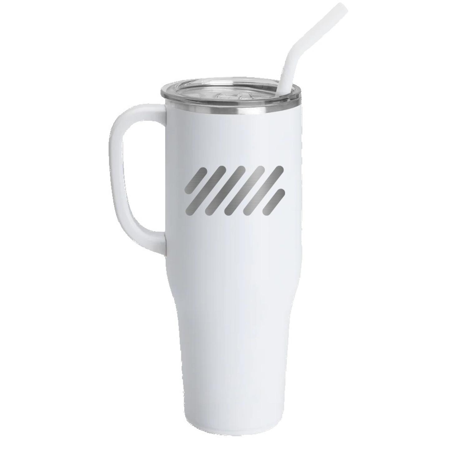 The Swig 40oz Mega Mug triple insulated, stainless steel construction keeps drinks cold for 24 hours and hot for 9. The cupholder friendly frame and comfort-grip handle makes this a travel mug that can go from home to the office with ease. The silicone flex-tip straw fits into the spill-resistant slider lid so you can sip on the go. 9.9″ L x 5.9″ W x 5.9″ H