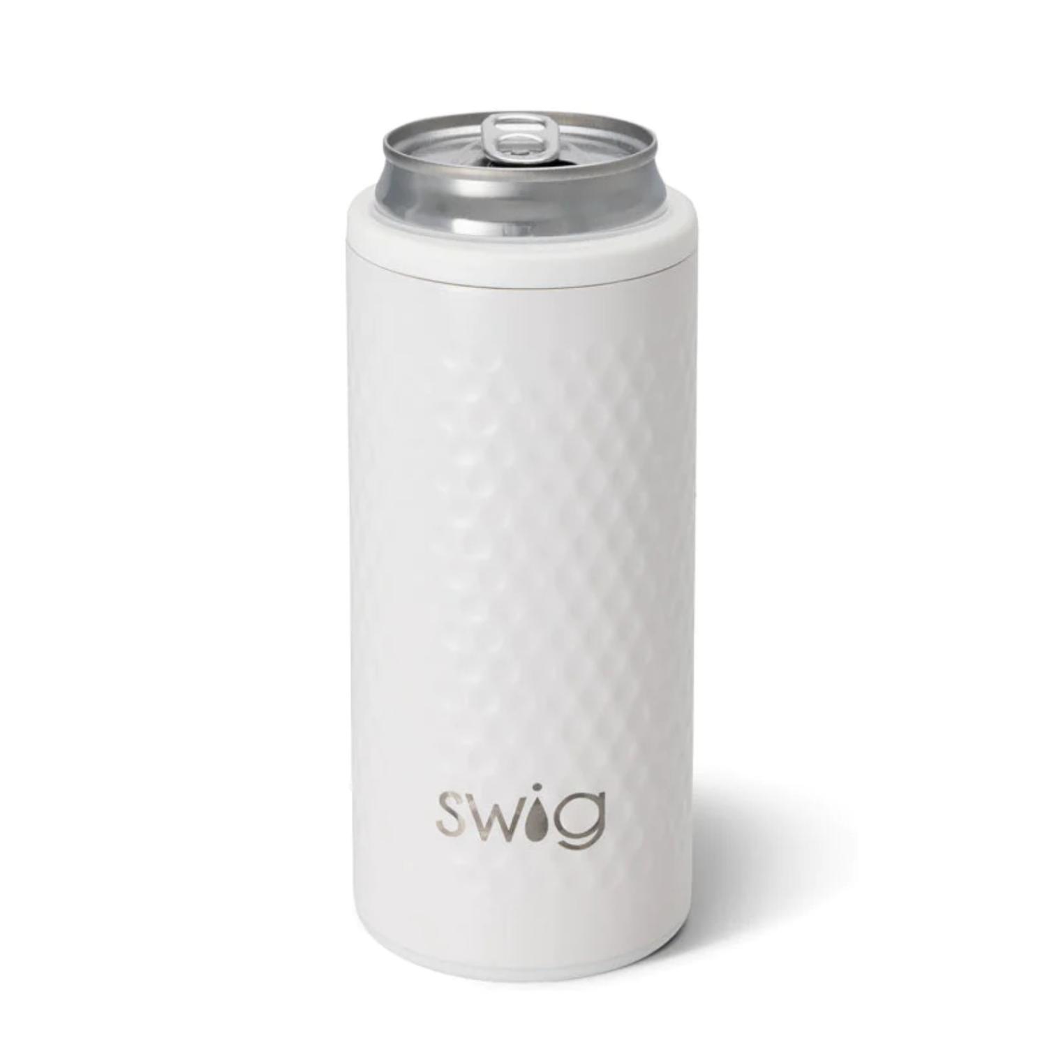 The Swiglife Golf Slim Can Cooler has feels like holding a golf ball with the dimples. Holds most 12 Oz. slim can beverages including hard seltzers, beer, energy drinks, sodas, and sparkling water. Keeps drinks cold 9+ hours and hot 3+ hours, triple insulation technology: double-walled, vacuum-sealed and copper-plated, condensation free and non-breakable, constructed of 18/8 stainless steel, fits most standard cup holders, and is slip-free, scratch-free. 4 3/4″ H x 3″ W